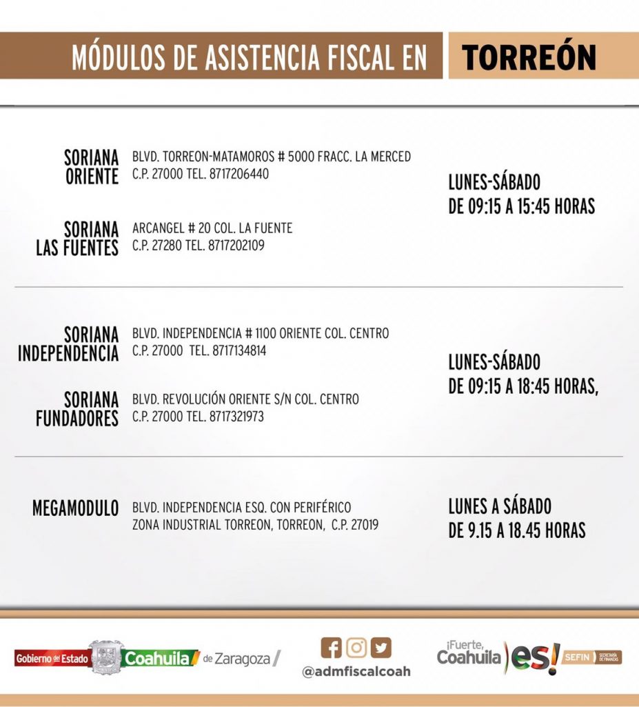 Para Torreón, los módulos ubicados en Soriana Oriente y Soriana Las Fuentes atienden de lunes a sábado de 09:15 a 15:45 horas.
