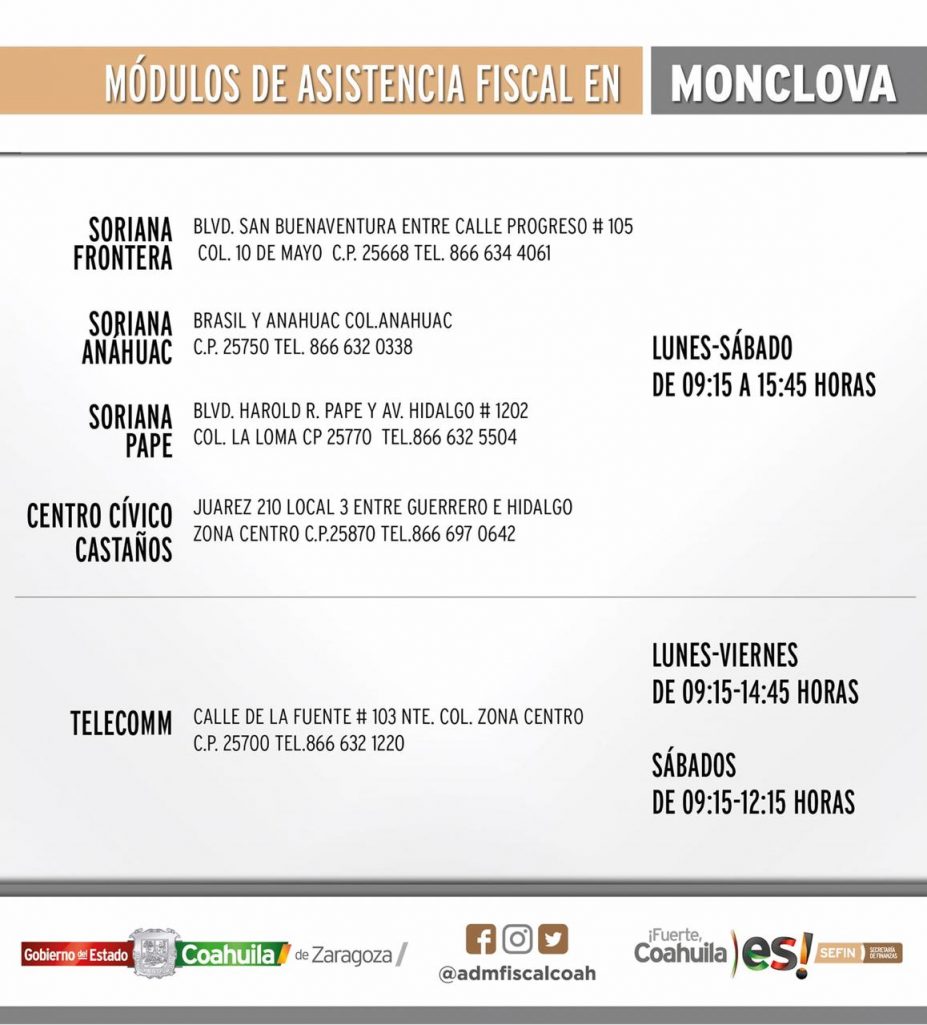En Monclova y la Región Centro, los módulos de asistencia fiscal disponibles en Soriana Frontera, Soriana Anáhuac, Soriana Pape y el Centro Cívico de Castaños estarán abiertos de lunes a sábado de 09:15 a 15:45 horas. El módulo ubicado en TELECOMM atenderá de lunes a viernes de 09:15 a 14:45 horas.