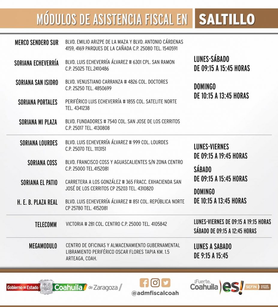 En Saltillo, los módulos se ubican en Merco Sendero Sur, Soriana Echeverría, Soriana San Isidro, Soriana Portales, Soriana Mi Plaza. En estos sitios el horario de atención es de lunes a sábado de 09:15 a 15:45 horas, y el domingo de 10:15 a 13:45 horas.