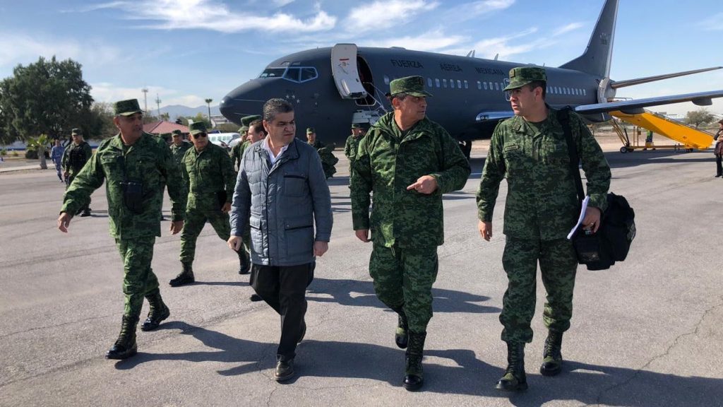 En reunión de trabajo para la construcción del esquema de seguridad pública en la zona, Riquelme Solís recibió al Gobernador de Durango, José Rosas Aispuro Torres, y al titular de la Secretaría de la Defensa Nacional, el General Luis C. Sandoval.