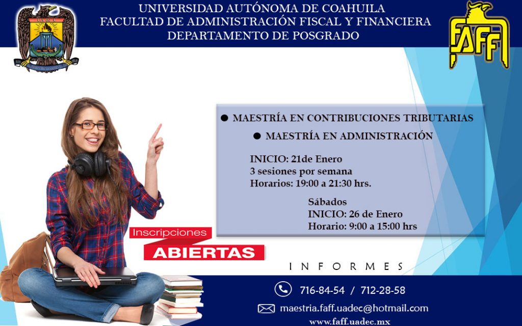Torreón.- La Facultad de Administración Fiscal y Financiera FAFF de la Universidad Autónoma de Coahuila Unidad Torreón, convoca a cursar sus Maestrías en Contribuciones Tributarias y Administración.
