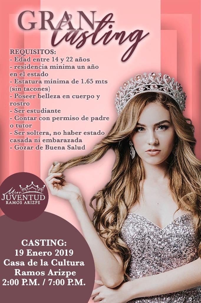 Francisco Misael Gil Ortiz, director del certamen Miss Juventud Ramos Arizpe 2019, invita a todas las interesadas a participar en el casting de selección para este certamen, mismo que se realizará este próximo 19 de enero en la Casa de la Cultura Municipal.
