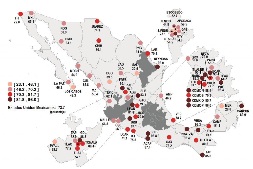 El INEGI dio a conocer que otras de las ciudades las ciudades con menor percepción de inseguridad fueron San Pedro Garza García con 23.1%, Mérida con 28.8, Puerto Vallarta con 38.7%, Durango con 39.5 y Los Cabos con 42.3% y Saltillo con el 30.5%.
