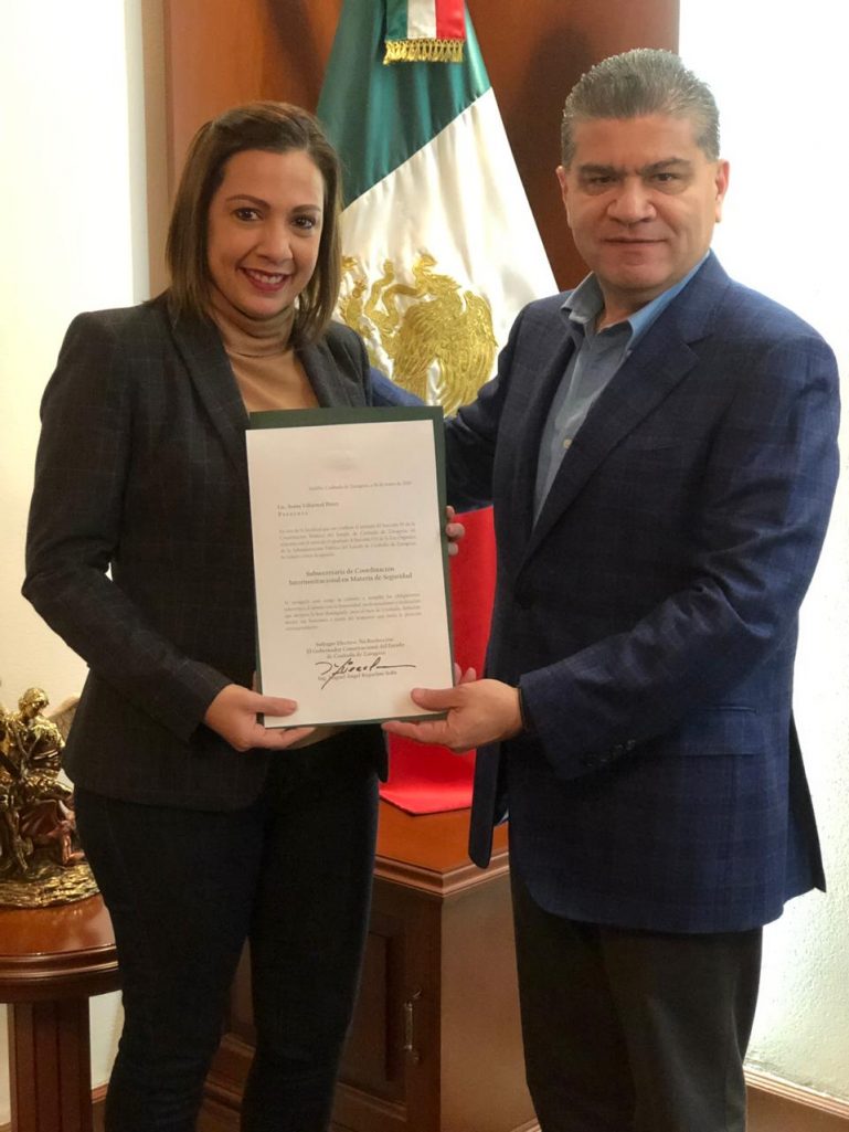 El gobernador Miguel Ángel Riquelme Solís entregó el nombramiento como subsecretaria de Coordinación Interinstitucional en Materia de Seguridad de la Secretaría de Gobierno a Sonia Villarreal Pérez.