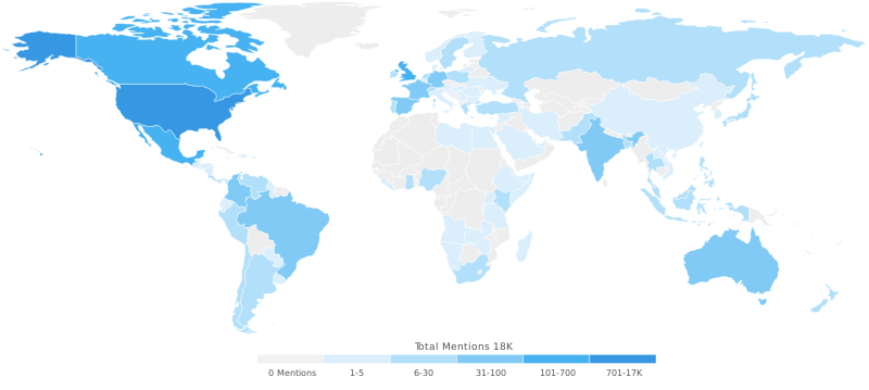 Mucho se ha hablado del espectáculo que se ha convertido en uno de los principales motivos de reunión de familias y amigos en todo el mundo. Los países que más publicaron sobre el Super Bowl durante el partido son de América: Estados Unidos, Canadá, México, Brasil y Colombia, respectivamente; mientras que España, Francia, Australia y Alemania secundaron la conversación. El 3 de febrero, durante la emisión LVIII del Super Bowl, se detectaron más de 1,800,000 menciones en redes sociales alrededor del mundo.