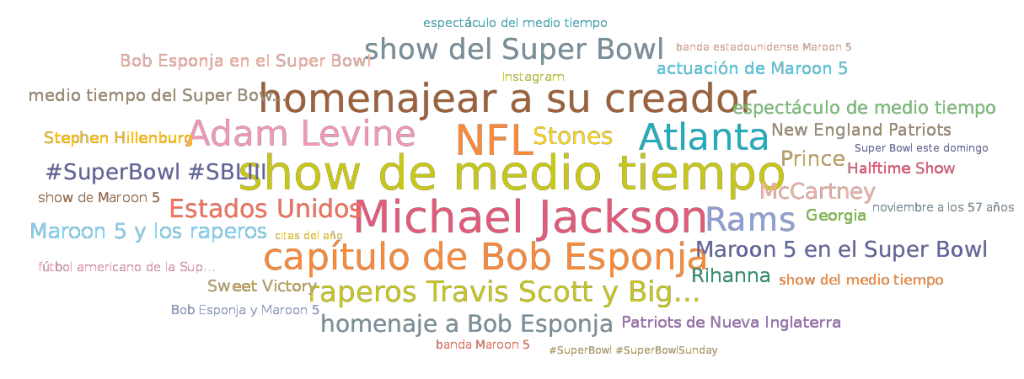 Los temas principales de conversación en la materia, fueron: Bob Esponja, Michael Jackson, Paul McCartney, Adam Levine (por encima de las menciones de su banda Maroon 5) y “los raperos”, aunque sus nombres no se hicieron presentes en la nube de tópicos.