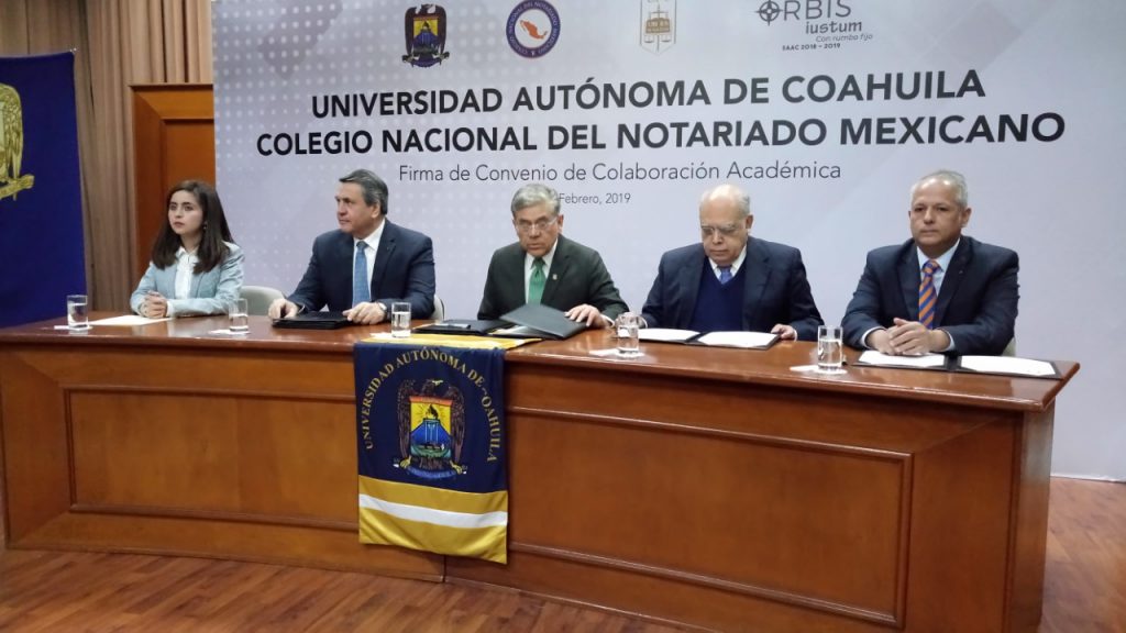 Este martes en instalaciones de la Facultad de Jurisprudencia de la UA de C, se llevó a cabo la firma de un convenio de colaboración académica entre esa casa de estudios, y el Colegio Nacional del Notariado Mexicano, mismo que permitirá la realización de diferentes cursos y actividades que permitan un acercamiento institucional que beneficie tanto a los alumnos de dicha facultad, como a los notarios que forman parte de este colegio.
