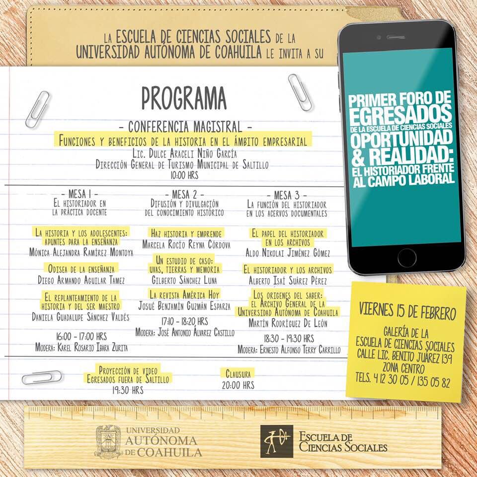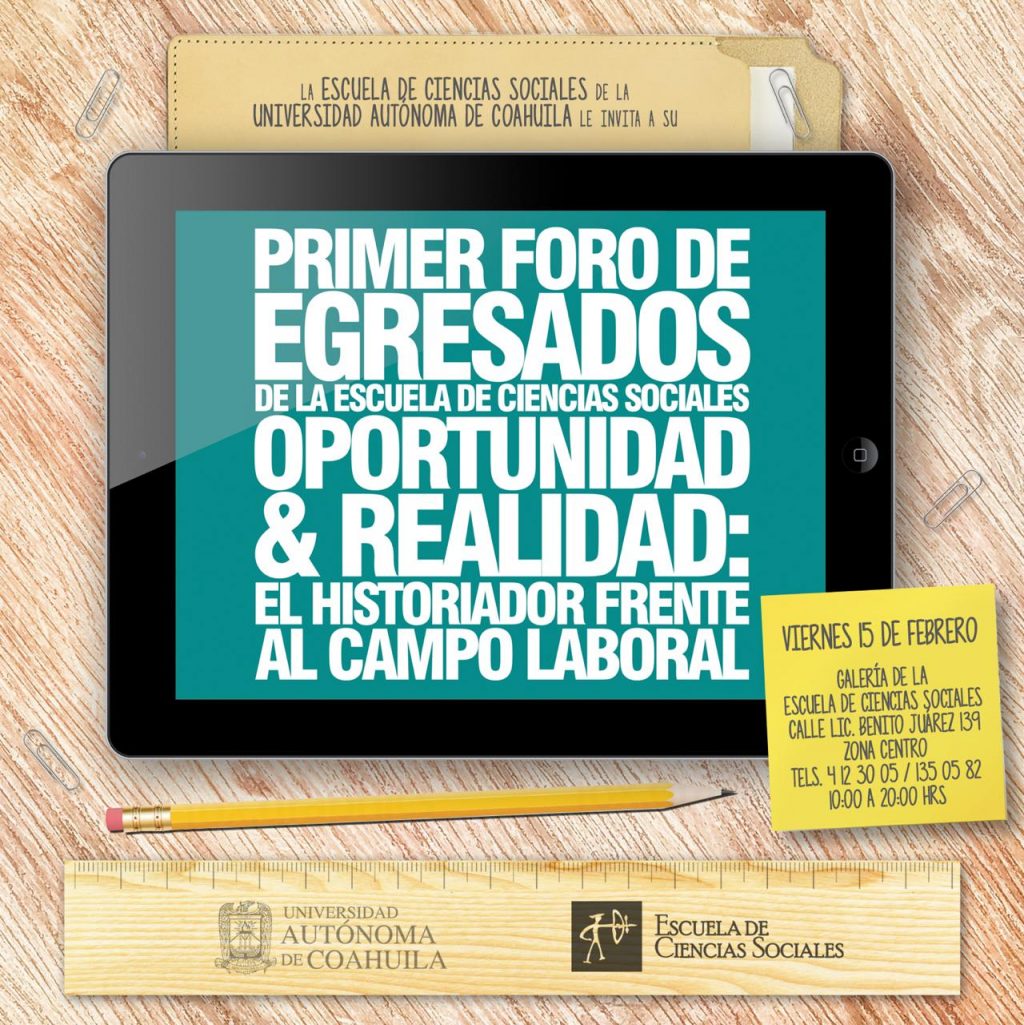 La Universidad Autónoma de Coahuila, a través de la Escuela de Ciencias Sociales, invita a participar en el Primer Foro de Egresados “Oportunidad y Realidad: El Historiador Frente al Campo Laboral”, a efectuarse este viernes 15 de febrero.