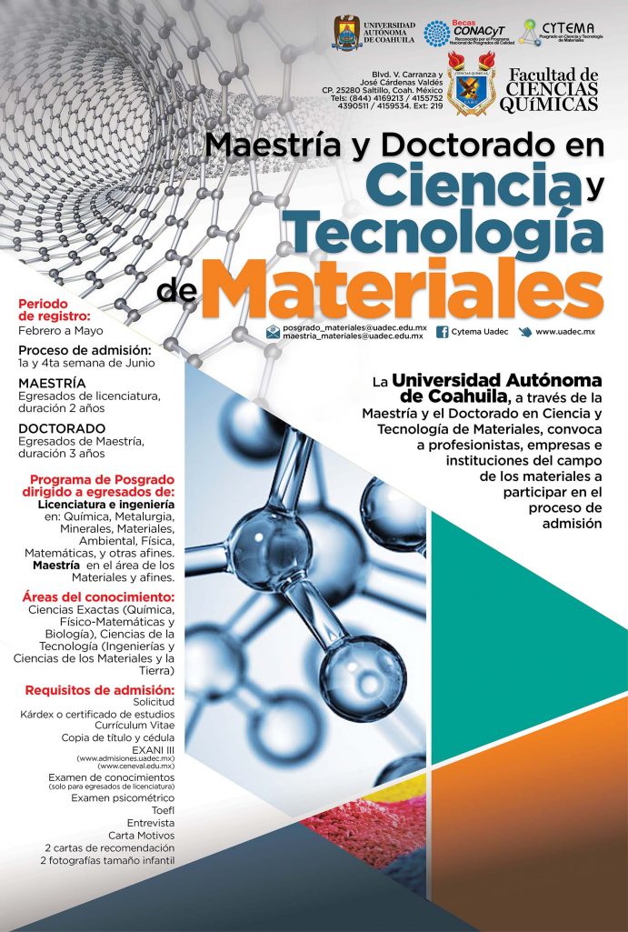 El periodo de registro es de febrero a mayo de 2019 y el proceso de admisión en el mes de junio; para más información acudir a la Facultad de Ciencias Químicas en la Coordinación de Posgrado en Ciencia y Tecnología de Materiales o comunicarse a los teléfonos (844) 4 16 92 13, 4 15 57 52, 4 39 05 11 y 4 15 95 34. (EL HERALDO)