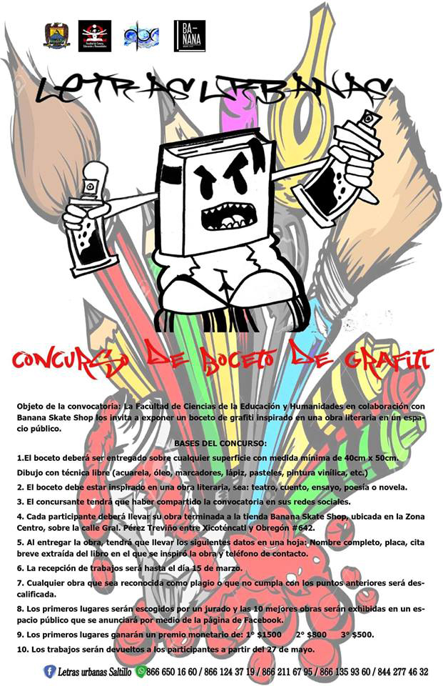 Con el objetivo de abrir un espacio en el que los universitarios y el público en general puedan expresarse a través del arte, la Facultad de Ciencias de la Educación y Humanidades de la Universidad Autónoma de Coahuila, invita al concurso de Boceto de Grafiti.