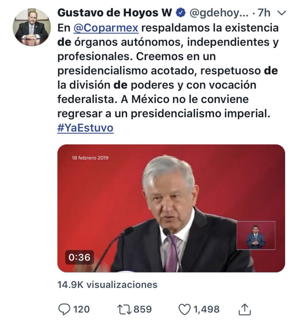 Según informó el sitio web Expansión.mx, el presidente de la Confederación Patronal de la República Mexicana (Coparmex) dijo que el sector cree en un presidencialismo acotado, respetuoso de la división de poderes y con vocación federalista.