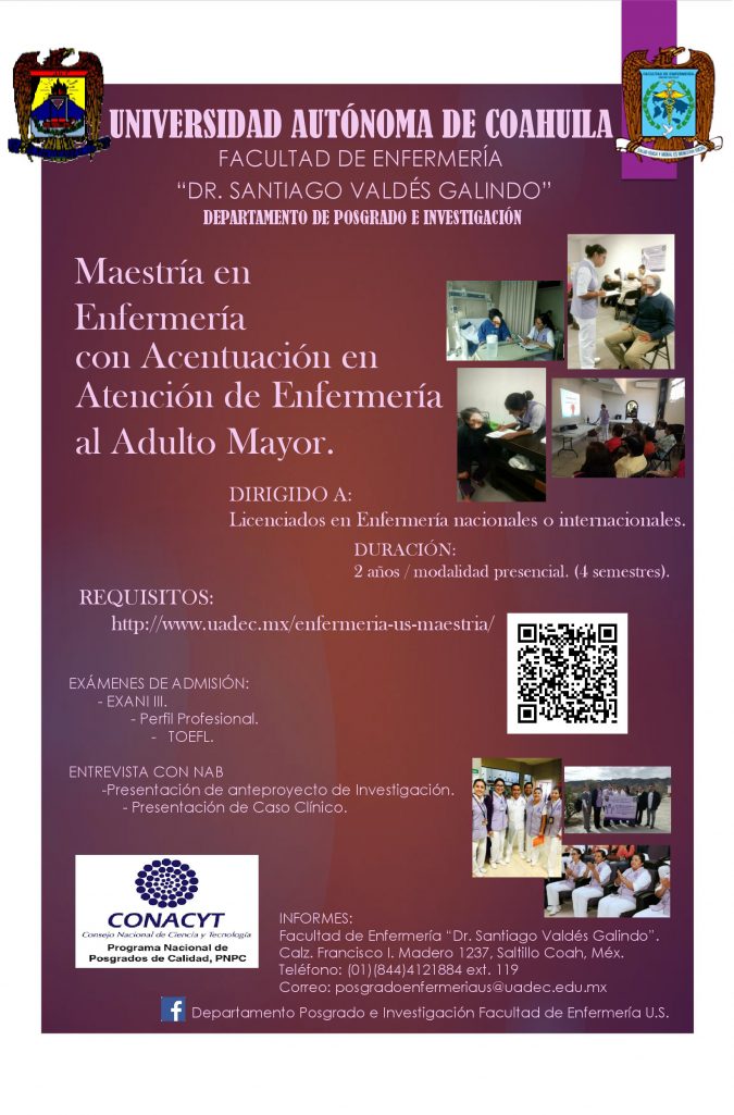 La Universidad Autónoma de Coahuila, a través de la Facultad de Enfermería “Dr. Santiago Valdés Galindo”, convoca a inscribirse en la Maestría en Enfermería con Acentuación en Atención de Enfermería al Adulto Mayor.