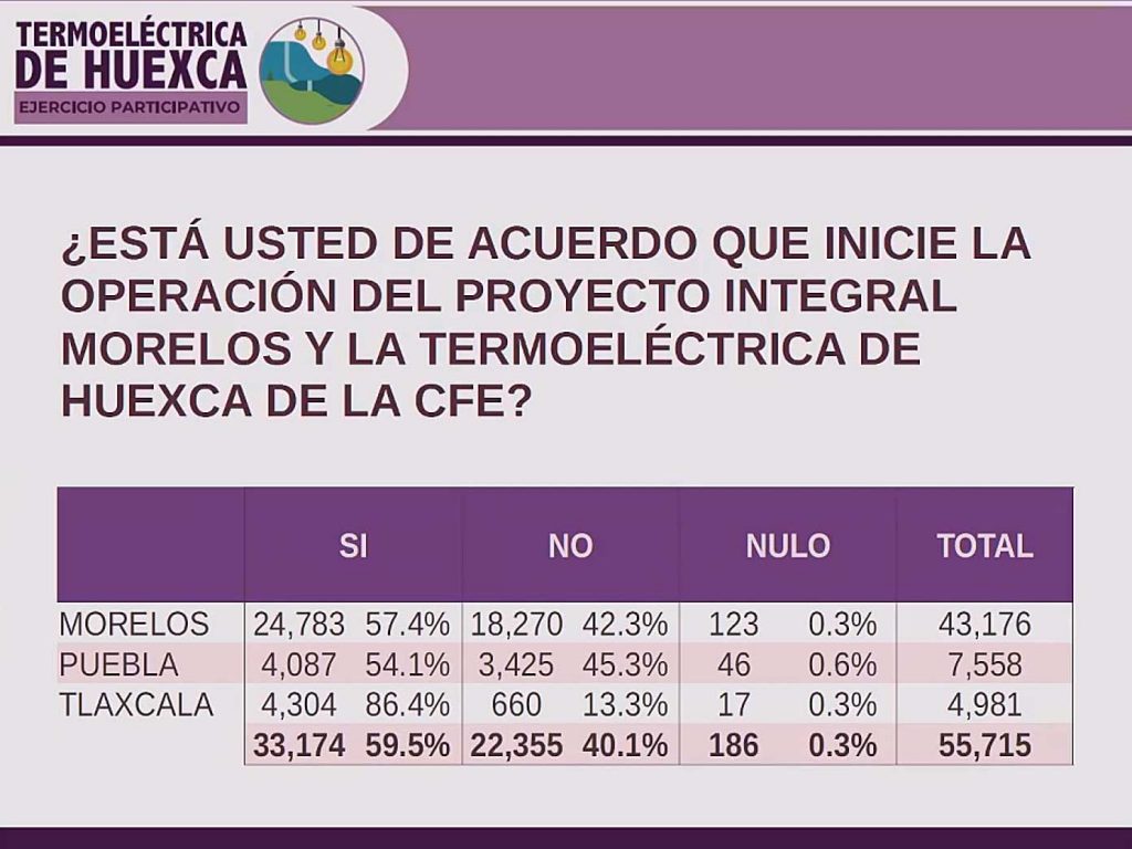 El periódico Excélsior publicó en su página web que en conferencia, el mandatario explicó que los días sábado y domingo participaron 55 mil 715 ciudadanos en la consulta y de estos, 40.1 por ciento se opusieron a la planta y 59.5 por ciento respaldaron el proyecto.