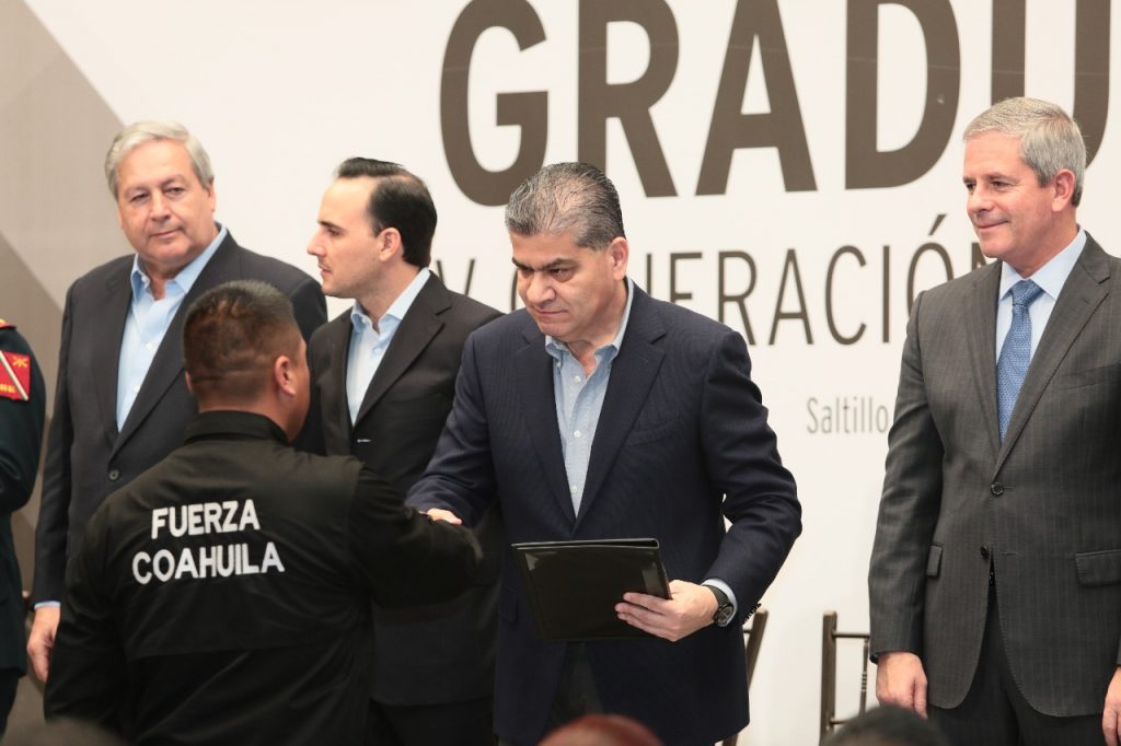 «Los policías en Coahuila van a ganar hasta 24 mil pesos y van a ir en escalafón, de acuerdo al modelo organizacional… y a los tres meses ya tienen derecho a buscar el escalafón… el que quiere seguir siendo policía dentro del organigrama que nosotros llamamos policía civil, tiene derecho al ascenso de acuerdo a su actuación, los que de ellos son nombrados comandantes tienen derecho a otro tipo de ascenso y los que son encargados de grupo también tienen derecho a otro tipo de sueldo y ascenso», expuso.