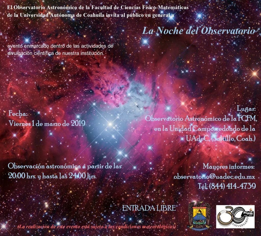 La Universidad Autónoma de Coahuila invita al público en general a disfrutar de los cuerpos celestes en la Noche del Observatorio, este viernes 1 de marzo, como parte de las actividades de divulgación científica de la máxima casa de estudios.
