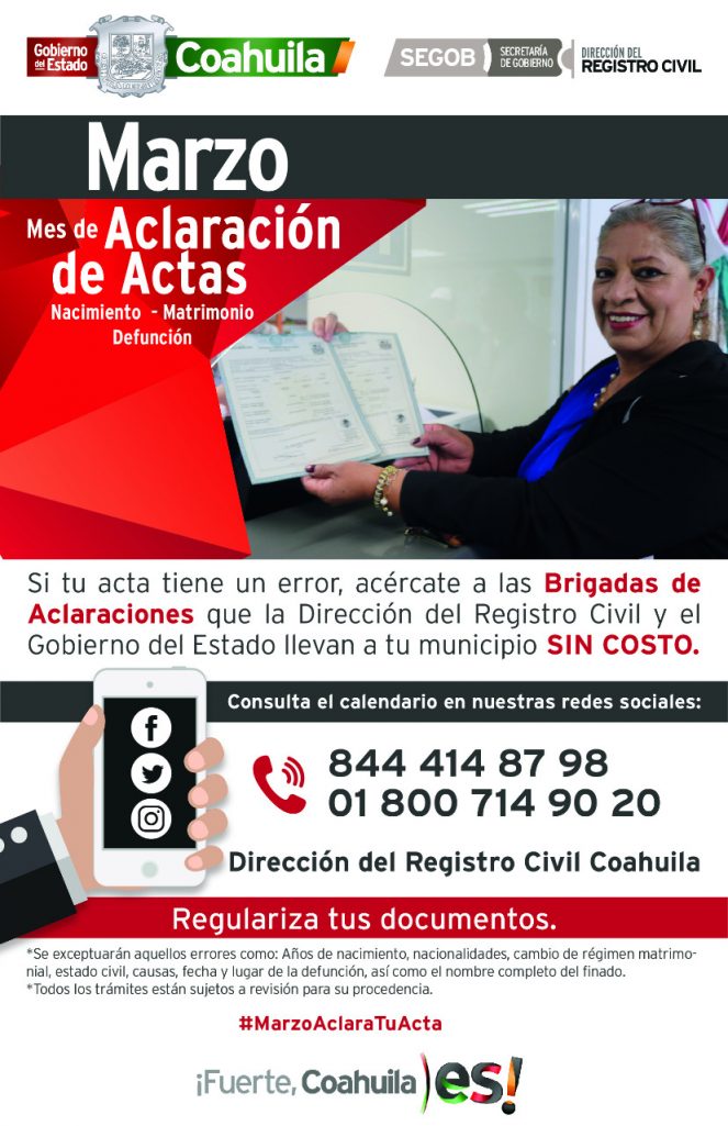 Monclova.– la Secretaría de Gobierno del Estado, a través de la Dirección del Registro Civil en Coahuila, realiza la invitación a la población en general a participar en las brigadas de aclaraciones que se realizarán todo el mes de marzo sin costo.