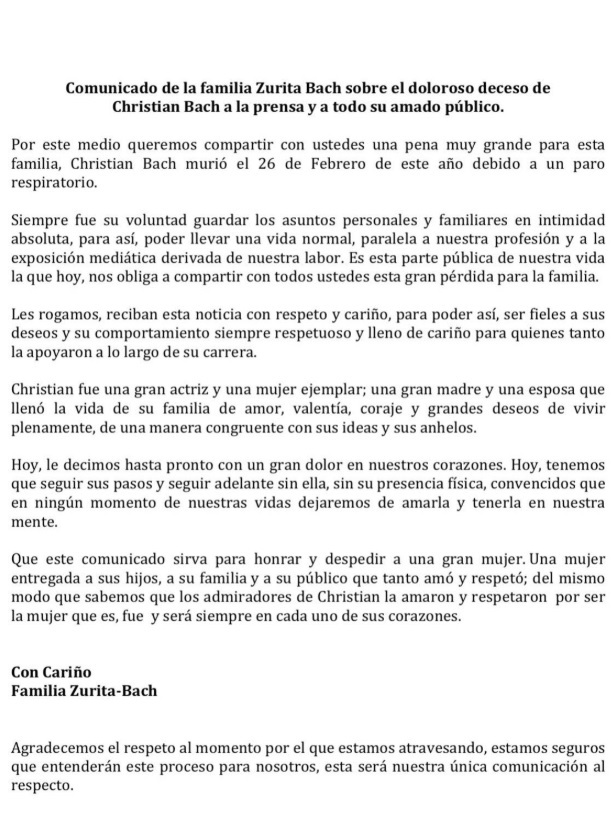 A través de un comunicado, la familia Zurita Bach, informó que el doloroso deceso sucedió el pasado 26 de febrero debido a un paro respiratorio.