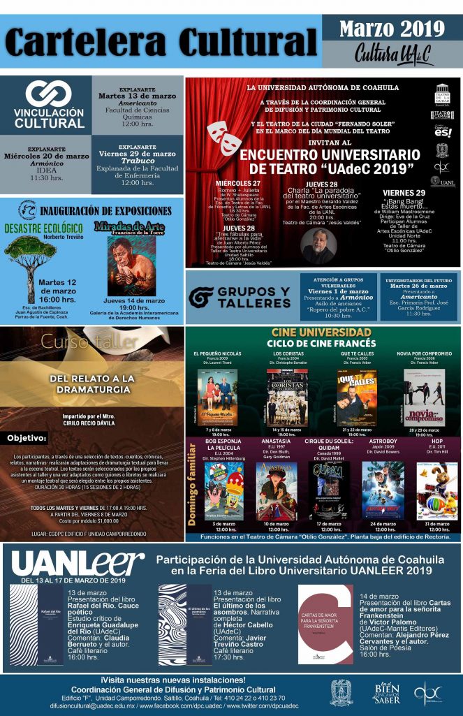 La Universidad Autónoma de Coahuila, a través de la Coordinación General de Difusión y Patrimonio Cultural, invita a la comunidad universitaria y público en general a disfrutar y participar en las actividades artísticas y culturales a realizarse durante marzo.