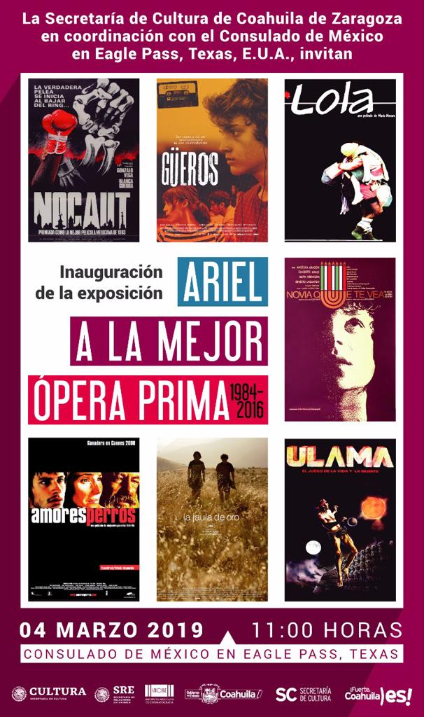 Piedras Negras.- “Ariel a la Mejor Ópera Prima” es la exposición que la Secretaría de Cultura del Estado mantiene en el Consulado de México en Eagle Pass, Texas, con el interés de que la comunidad de ambas fronteras pueda apreciar la muestra de más de 20 carteles de películas galardonadas en México y reconocidas internacionalmente.