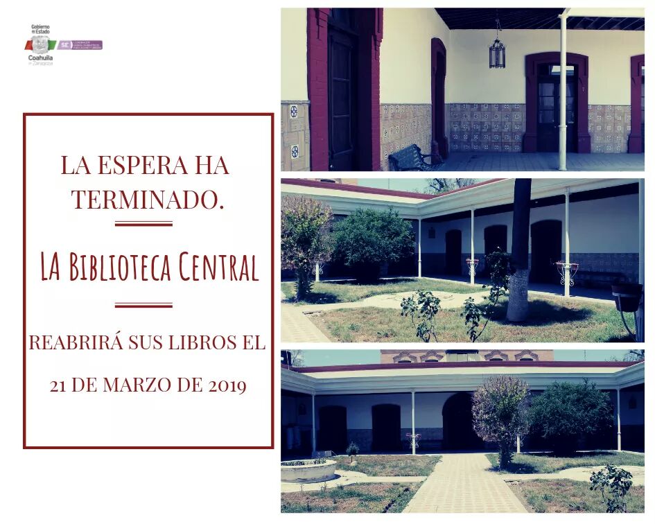 A través de la red social de Facebook, la Coordinación de Bibliotecas Públicas, Publicaciones y Librerías de Coahuila ha dado a conocer que este 21 de marzo, luego de casi ocho meses de trabajos de remodelación, abrirá finalmente sus puertas la nueva Biblioteca Pública Central, cuyas instalaciones estarán ubicadas en la calle Xicoténcatl número 380 metros antes de Ramos Arizpe, donde anteriormente se encontraba el internado de la Escuela Normal.