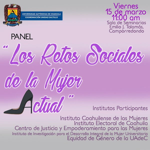 Dando continuidad a las labores de inclusión y equidad de género en la sociedad, la Unidad Saltillo de la Universidad Autónoma de Coahuila (UA de C), realizará este próximo viernes a partir de las 11:00 de la mañana, el panel «Los Retos de la Mujer Actual», en la Sala de Seminarios «Emilio J. Talamás».