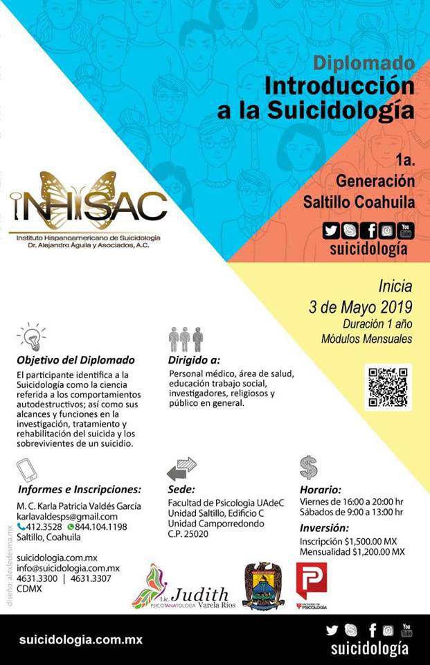 La Universidad Autónoma de Coahuila, a través de la Facultad de Psicología, en coordinación con el Instituto Hispanoamericano de Suicidiología, Dr. Alejandro Águila y Asociados, A.C., convocan a participar en el Diplomado Introducción a la Suicidiología.