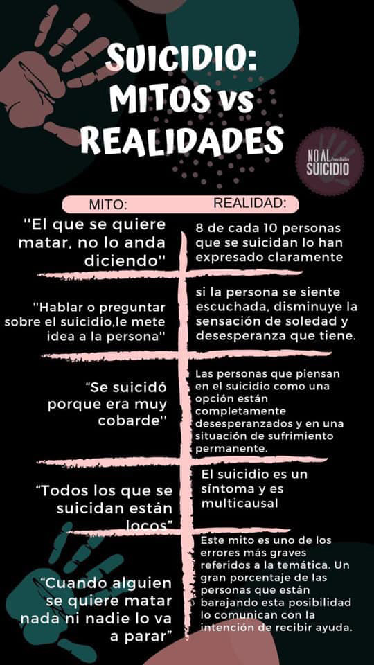 Existen mitos alrededor del suicidio como “el que se quiere matar, no lo anda diciendo”, sin embargo, se sabe que 8 de cada 10 personas que se suicidan lo han expresado claramente; o el de “todos los que se suicidan están locos”, sin embargo, el suicidio es un síntoma y es multicausal.