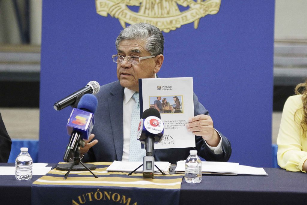 El rector de la Universidad Autónoma de Coahuila, Salvador Hernández Vélez, acompañado por funcionarios de la máxima casa de estudios, se reunió con diversos organismos de la sociedad civil para dar a conocer el avance en las acciones realizadas para la erradicación del acoso.