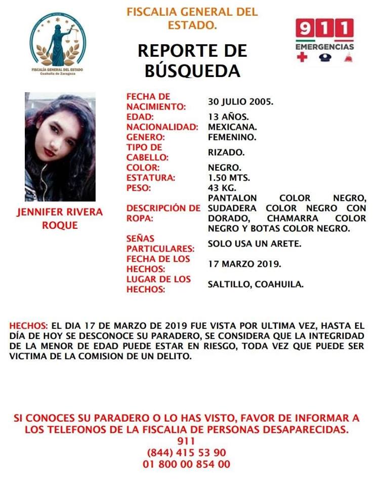 La Fiscalía de Personas Desaparecidas del Estado de Coahuila dio a conocer a través de su cuenta de Facebook solicitan la ayuda de la ciudadanía para localizar a la joven Jennifer Rivera del Bosque de 13 años de la que se desconoce su paradero desde el pasado 17 de marzo.
