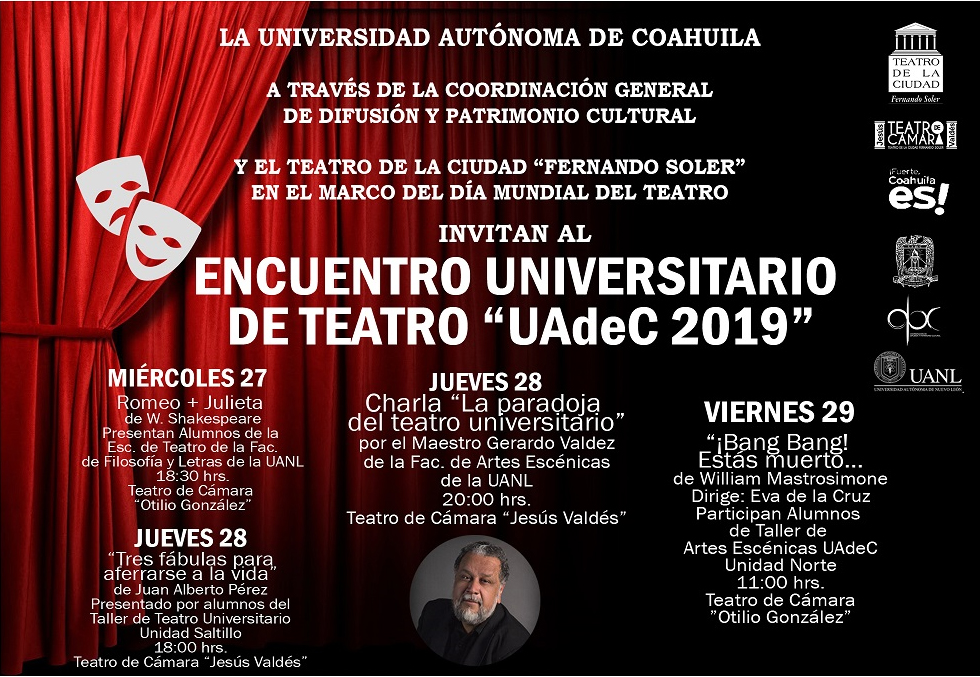 En el marco del Día Mundial del Teatro, la Universidad Autónoma de Coahuila, celebra el Encuentro Universitario de Teatro UA de C 2019, fecha instituida por la UNESCO el 27 de marzo de 1962.
