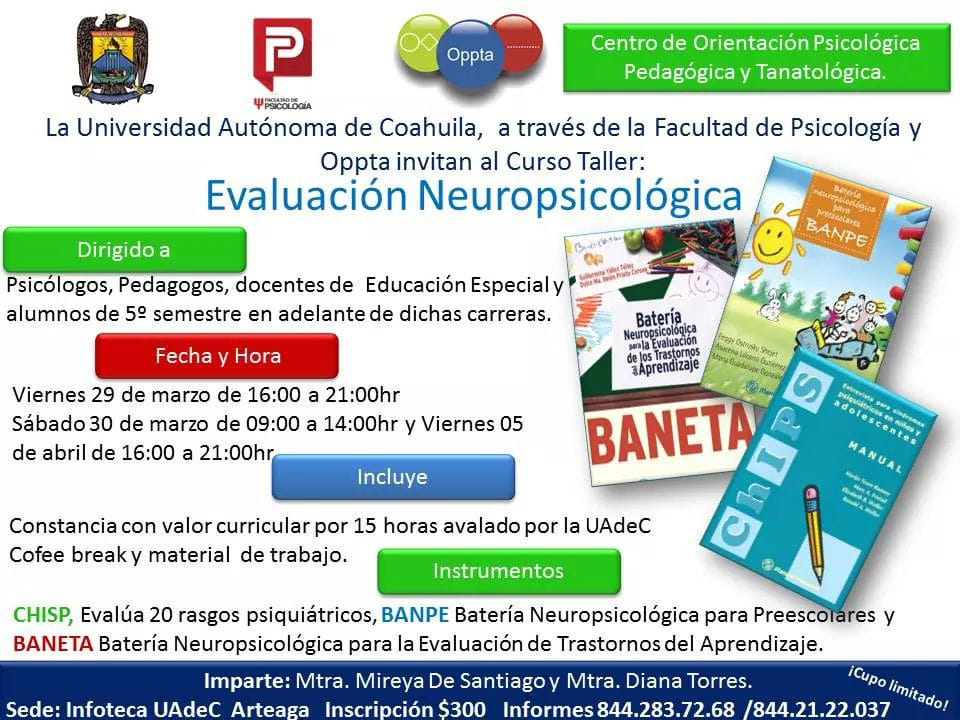 Este viernes 29 de marzo inician las sesiones del Curso-Taller Evaluación Neuropsicológica al que invita la Facultad de Psicología de la Universidad Autónoma de Coahuila en conjunto con el Centro de Orientación Psicológica, Pedagógica y Tanatológica, para los que estén interesados aún están a tiempo de inscribirse.