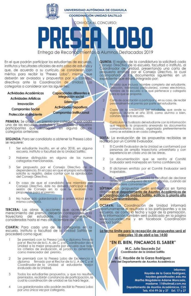 Como cada año la Universidad Autónoma de Coahuila, a través de la Coordinación de Unidad Saltillo, convoca a sus alumnos a participar en la Presea Lobo, que es reconocimiento a estudiantes destacados.