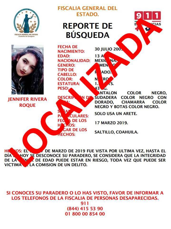 La Fiscalía General del Estado, a través del área de Alerta AMBER de la Fiscalía de personas Desaparecidas, en colaboración con la Fiscalía General del Estado de Jalisco y Alerta AMBER Jalisco, lograron la localización de la menor Jennifer Rivera Roque, de 13 años de edad, quien se encontraba desaparecida desde el pasado 17 de marzo.