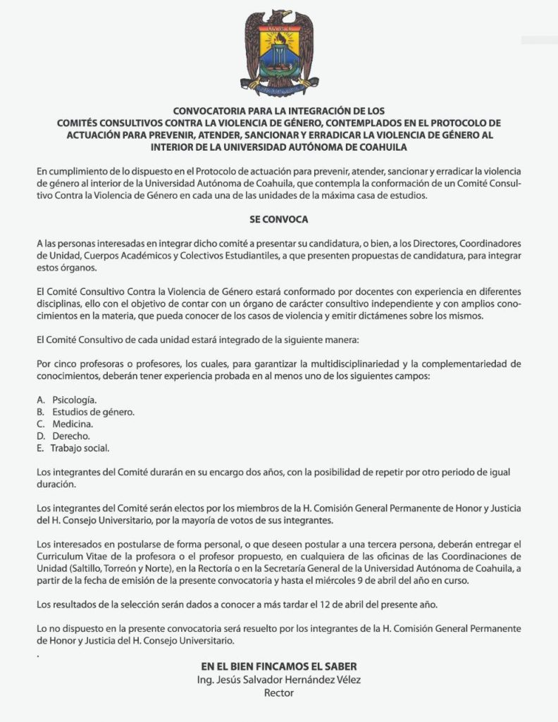 La Universidad Autónoma de Coahuila, convoca a la planta docente a formar parte de los Comités Consultivos Contra la Violencia de Género, contemplados en el Protocolo de Actuación para Prevenir, Atender, Sancionar y Erradicar la Violencia de Género al Interior de la UA de C.