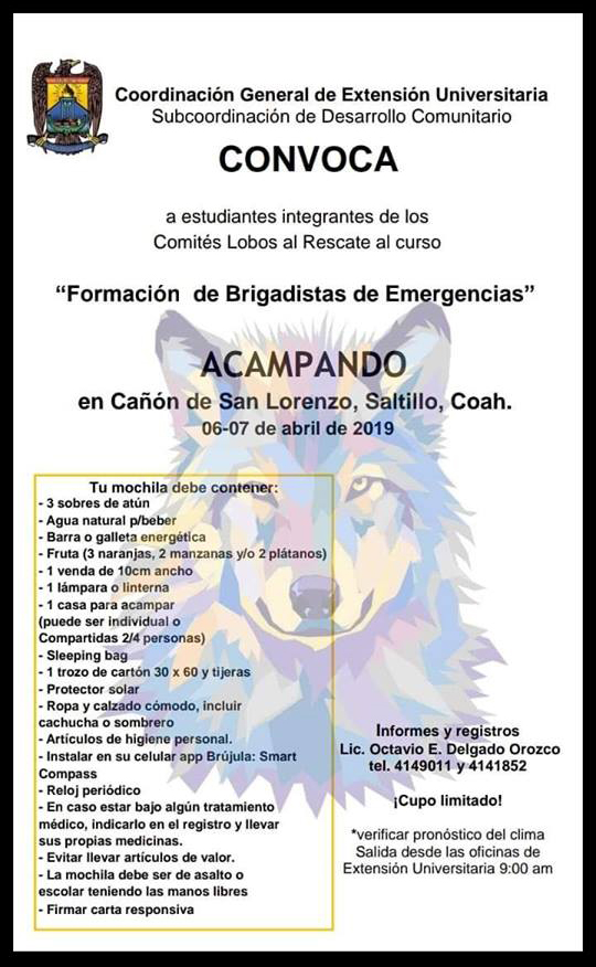 La Coordinación General de Extensión Universitaria y la Subcoordinación de Desarrollo Comunitario de la Universidad Autónoma de Coahuila, convocan a estudiantes integrantes de los Comités de Lobos al Rescate al curso “Formación de Brigadistas de Emergencia”.