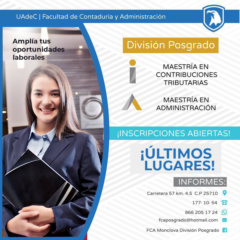 Monclova.- La Universidad Autónoma de Coahuila, a través de la Facultad de Contaduría y Administración de la Unidad Norte, convocan a los interesados a cursar la Maestría en Administración con duración de dos años.