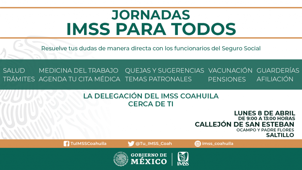La Delegación Coahuila del Instituto Mexicano del Seguro Social (IMSS) realizará este lunes en el Callejón de San Esteban (Ocampo y Padre Flores. Centro Histórico), una nueva emisión de sus «Jornadas IMSS Para Todos», en la que brindará servicios como atención y quejas de usuarios, vacunación, inscripción a guarderías, pensiones y, por supuesto, afiliación.