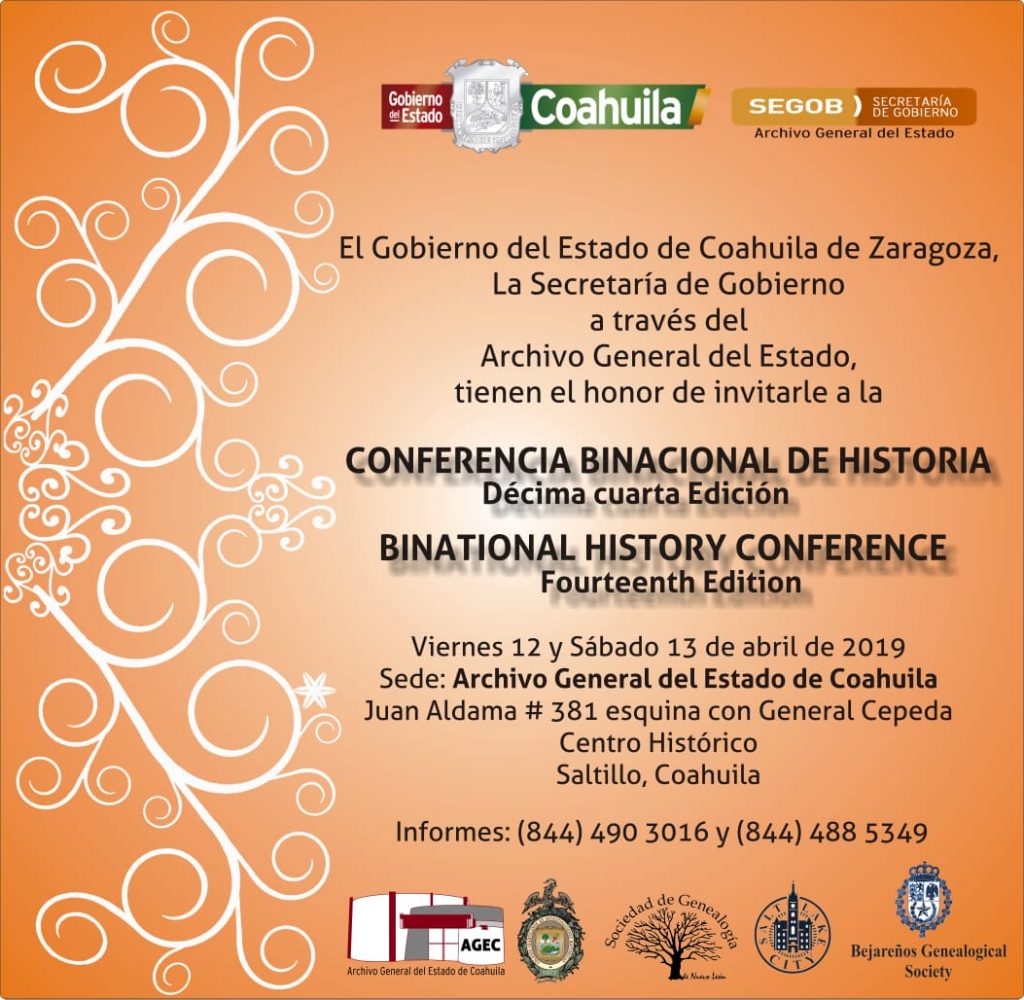 El Archivo General del Estado (Aldama 381. Centro Histórico) realizará a partir del próximo viernes 12 de abril, su Décima Cuarta Edición de la Conferencia Binacional de Historia que reúne a especialistas de la materia enfocada en la genealogía del norte de México, siendo una importante plataforma para conocer a profundidad sobre el tema.