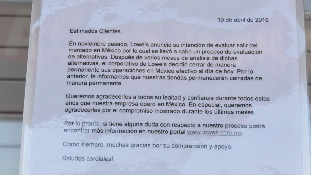 “Después de varios meses de análisis de dichas alternativas, el corporativo de Lowe’s decidió cerrar de manera permanente sus operaciones en México efectivo al día de hoy (sic), por lo anterior le informamos que nuestras tiendas permanecerán cerradas de manera permanente”.