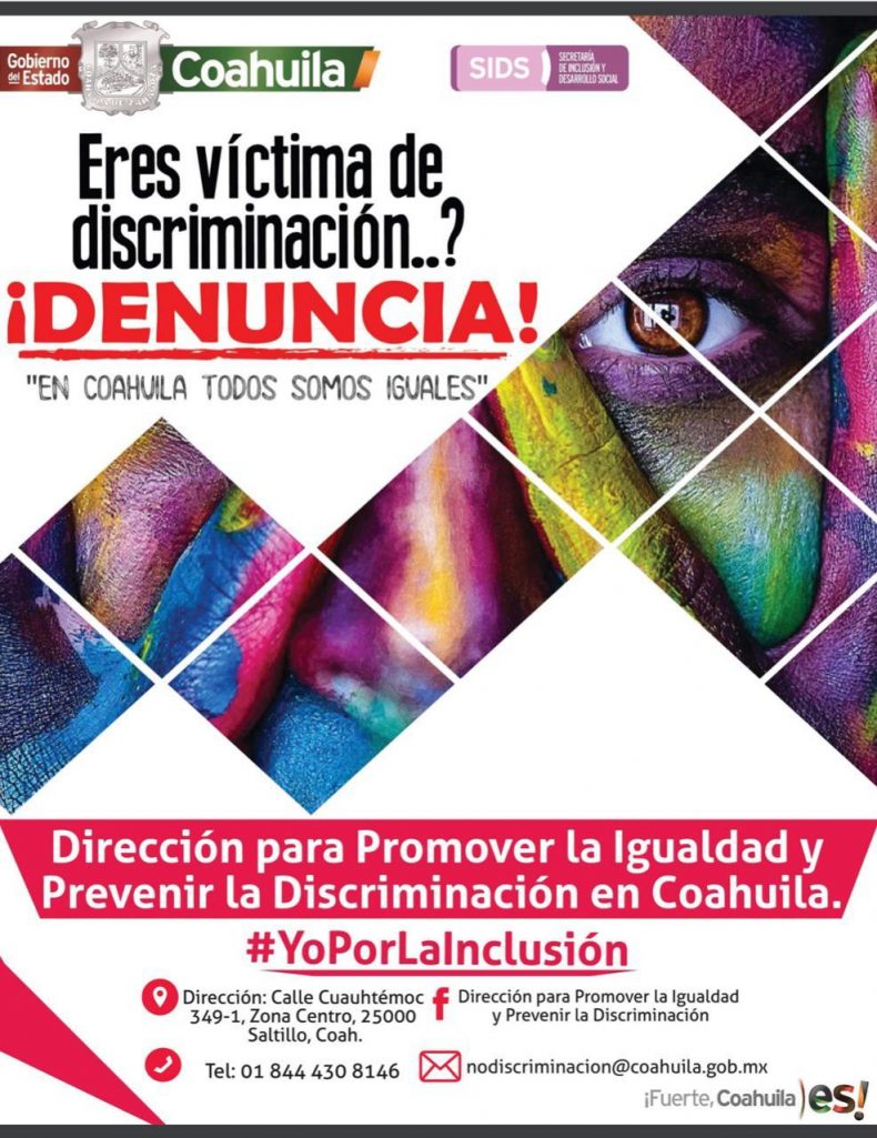Asimismo, destacó que cualquier persona que se sienta discriminada, rechazada o limitada en algún derecho en el territorio coahuilense, puede interponer su queja en las diferentes oficinas de enlace de la Secretaría de Inclusión y Desarrollo Social en el Estado, y en Saltillo pueden acudir a las oficinas ubicadas en la calle Cuauhtémoc # 349, Zona Centro, a un costado de la librería Carlos Monsiváis.