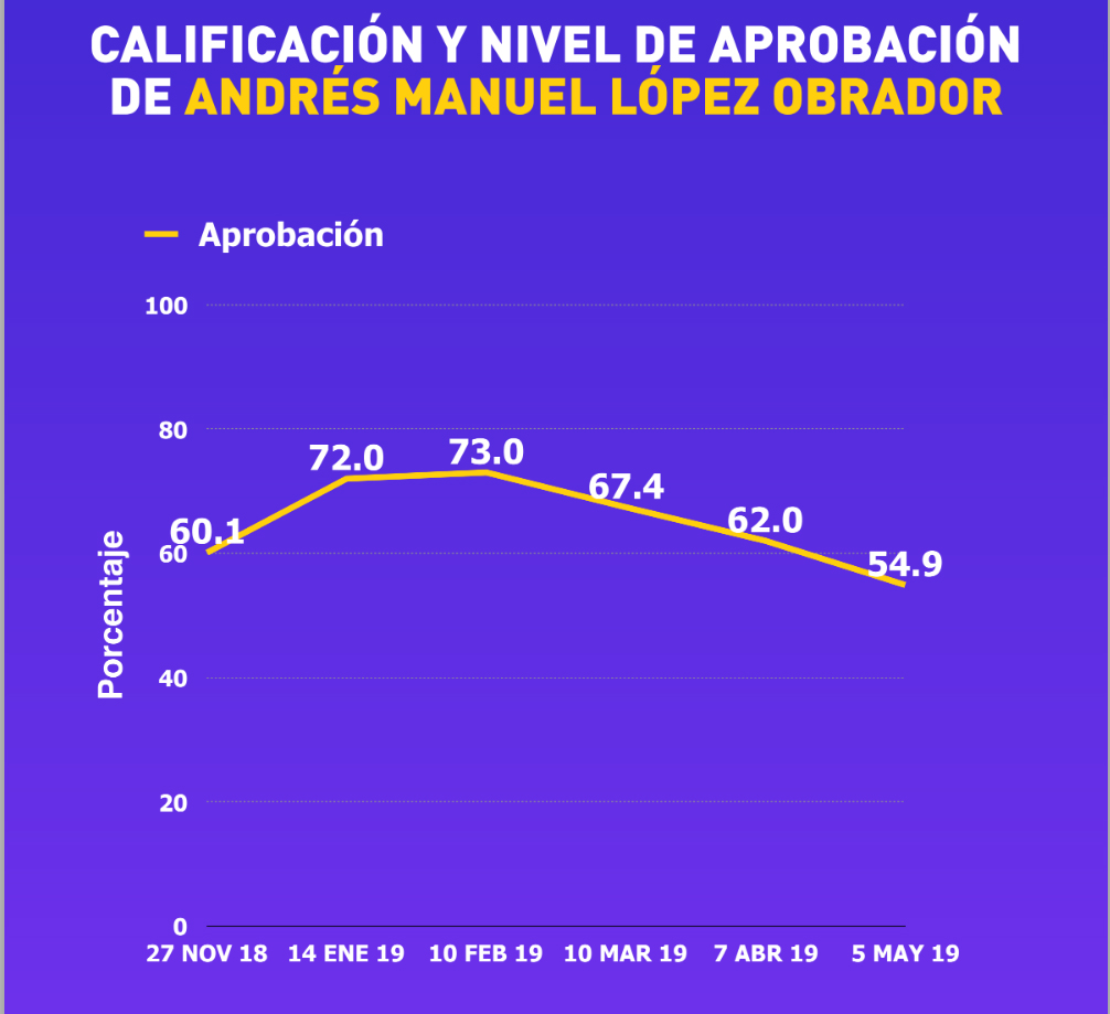 Después de contar con un impresionante índice de aprobación del 73% el pasado mes de febrero, en tan solo tres meses la popularidad del presidente Andrés Manuel López Obrador se está desplomando en picada, de tal forma que en mayo cuenta ya solamente con un 54.9% de aprobación, de acuerdo con la serie de encuestas mensuales que realiza la organización México Elige y cuyos resultados fueron difundidos este lunes en el noticiero radiofónico que conduce el periodista Ciro Gómez Leyva.