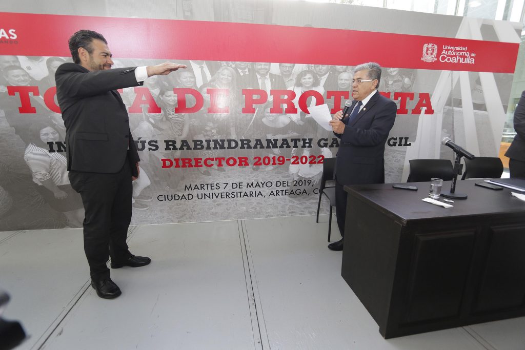 En un ambiente total de respaldo por la comunidad universitaria de la Facultad de Sistemas, el rector de la Universidad Autónoma de Coahuila, Salvador Hernández Vélez, tomó protesta a Jesús Rabindranath Galván Gil como director para el periodo 2019-2022.