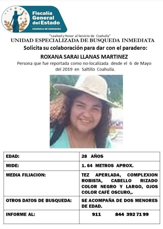 La Unidad Especializada de Búsqueda Inmediata activó el protocolo de búsqueda para dar con el paradero de Roxana Sarai Llanas Martínez, de 28 años de edad, quien fue reportada como “no localizada” desde el lunes 6 de mayo.