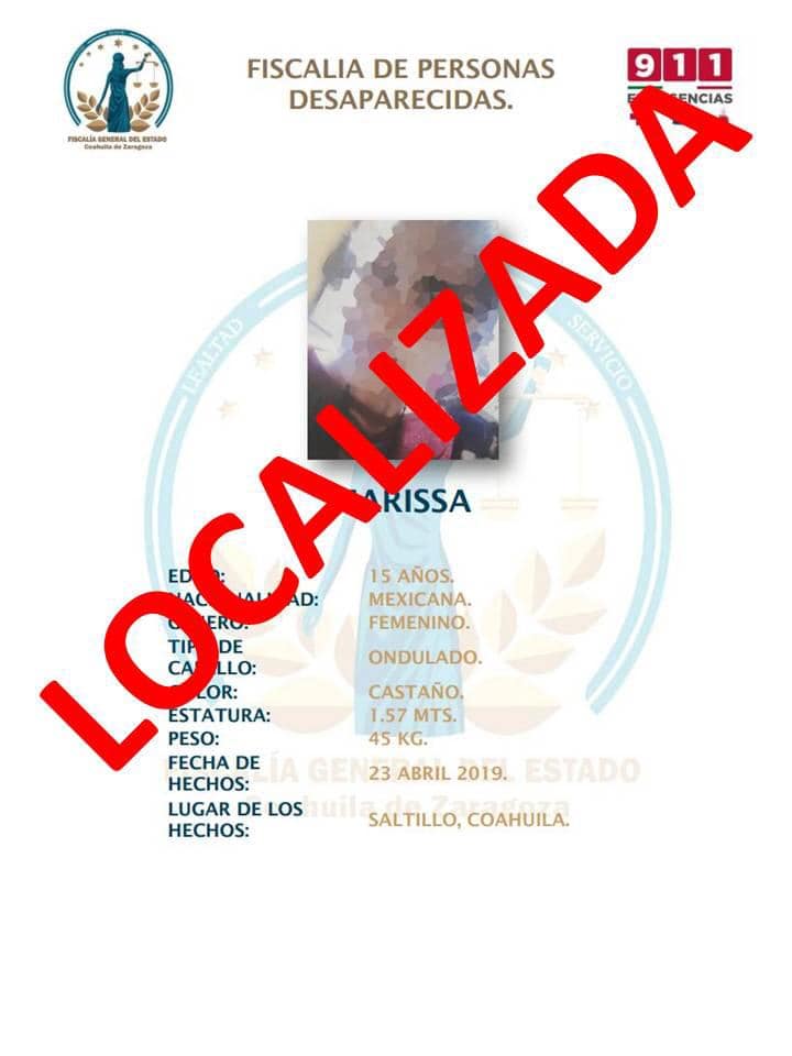 También se reportó la localización de Daniela de 14 años, quien fue vista por última vez el 28 de abril en la colonia Manantiales del Valle en Ramos Arizpe.