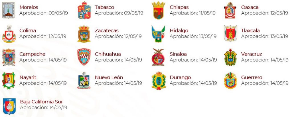 Las entidades que han aprobado los cambios a la ley educativa son: Morelos, Tabasco, Chiapas, Oaxaca, Colima, Zacatecas, Hidalgo, Tlaxcala, Campeche, Chihuahua, Sinaloa, Veracruz Nayarit, Nuevo León, Durango, Guerrero y Baja California Sur.