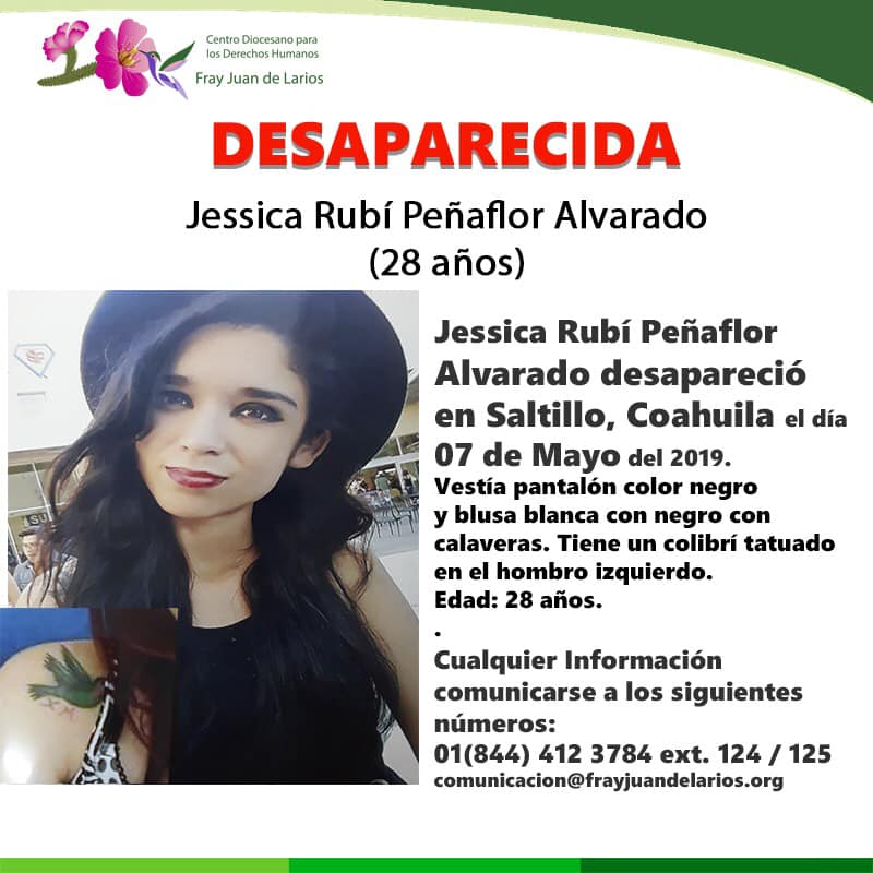 La joven saltillense Jessica Rubí Peñaflor Alvarado, de 28 años de edad, se encuentra desaparecida desde el pasado siete de mayo, según compartió el Centro Diocesano para los Derechos Humanos ‘Fray Juan de Larios’ en su página de Facebook.