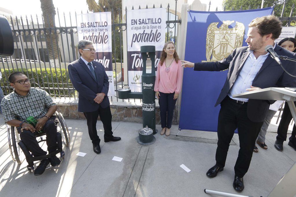 En la puerta exterior de la Facultad de Jurisprudencia, el rector de la Universidad Autónoma de Coahuila, Salvador Hernández Vélez, inauguró el bebedero acompañado por el gerente general de Aguas de Saltillo, Jordi Bosch, la maestra Marisol Díaz y los alumnos generadores de “Juris BB-Agua”.