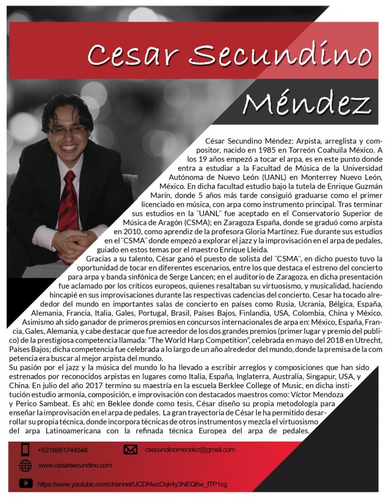 César Secundino Méndez es arpista, arreglista y compositor, nacido en 1985 en Torreón, Coahuila, México. A los 19 años empezó a tocar el arpa, es en este punto donde entra a estudiar a la Facultad de Música de la Universidad Autónoma de Nuevo León (UANL) en Monterrey Nuevo León, México.