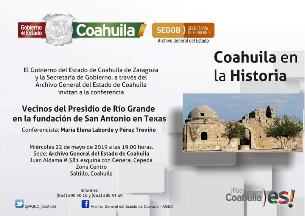 El Archivo General del Estado de Coahuila (Aldama 381. Centro Histórico) continúa en su sede con su programa de divulgación histórica al público en general, a través de «Coahuila en la Historia», ciclo de conferencias que este próximo miércoles a las 7:00 de la tarde, dará pie para la presentación de «Vecinos del Presidio de Río Grande en la Fundación de San Antonio en Texas», conferencia que será impartida por María Elena Laborde y Pérez Treviño.