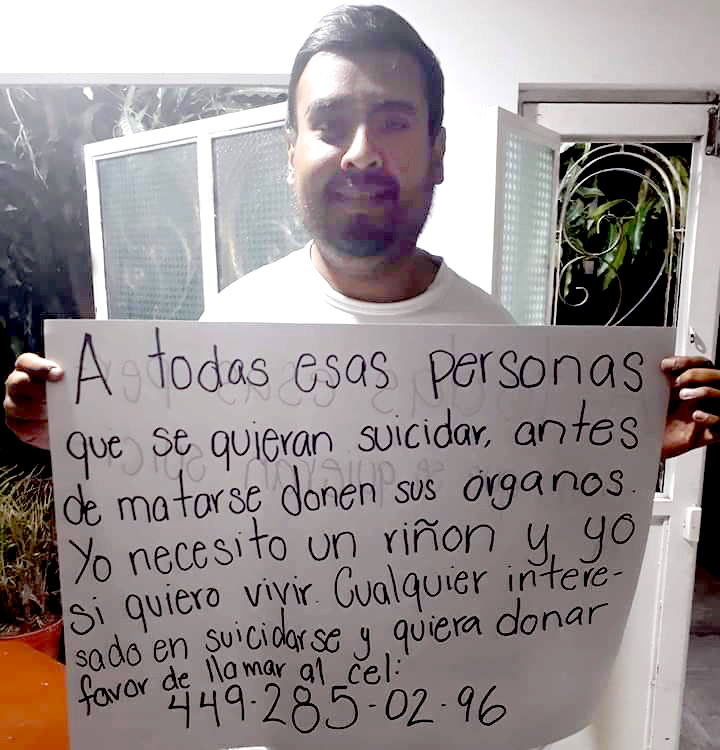 “Todas esas personas que se quieran suicidar, antes de matarse donen sus órganos. Yo necesito un riñón y yo si quiero vivir. Cualquier interesado en suicidarse y quiera donar, favor de llamar”, es el mensaje publicado por Jonathan Avilés hace una semana en su cuenta de Facebook, mismo que se volvió viral en cuestión de días.